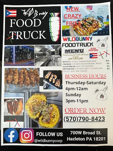 Wildbunny Food Truck offers a delightful and varied menu that combines bold flavors with a casual, vibrant street food experience. Among the standout items is the Tripleta, a Puerto Rican sandwich packed with juicy pork, chicken, and steak, offering a rich and satisfying meal. For those craving something more handheld, the Pincho is a delicious skewered meat option, perfect for on-the-go enjoyment. Another favorite is the crispy and savory Empanadas, which come in various fillings, each providing a satisfying bite. For a true taste of comfort, their Alcapurrias-deep-fried, savory fritters made from plantains or yuca-offer a crispy exterior and a soft, flavorful interior. If you're looking to share or just indulge in a hearty side, the Crazy Fries are a must-try. Loaded with toppings and bursting with flavor, they are a perfect combination of crispy fries with a mix of savory ingredients. The food truck’s menu, though compact, is packed with flavor, ensuring that there’s something for everyone to enjoy at an affordable price, making it a go-to for anyone in Hazleton, PA.